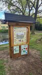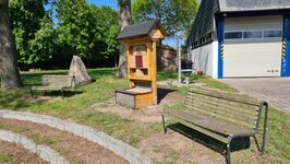 Die Kirchenkinder und Helfer stellten das Insektenhotel ursprünglich zwischen die großen Eichen am Bleichanger/Dorfteich auf. Da der Standort eher ungünstig für den gewünschten Zuzug gewählt wurde, stellte Uwe die Unterkunft zwischen die Teichbänke. Denn dort konnte die Sonne die zukünftigen und zum Teil bereits genutzten Brutplätze gut aufwärmen. Nun soll das Insektenhotel weichen, da dieser Platz durch die Feuerwehr genutzt werden würde (Zeltaufbau) so hieß es zunächst. Dann wurde festgestellt, dass die Jugendfeuerwehr den Platz zum Ein- und Aussteigen benötigt. Der aktuelle Stand ist der, dass das Insektenhotel beim Handtieren an den Feuerwehrfahrzeugen stört, obwohl der Abstand zur gepflasterten Fläche 3,7 Meter beträgt. Man sollte überlegen, die dortige Sitzbank zu entfernen, da diese doch deutlich dichter steht.